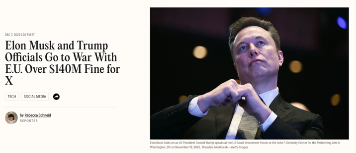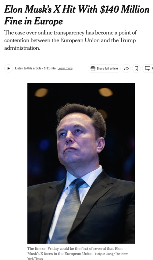 △《时代》杂志评论,欧委会的罚款激怒了马斯克和特朗普政府的几位高级官员,他们一直视美国科技公司在欧洲的监管问题为美欧关系的关键争议点