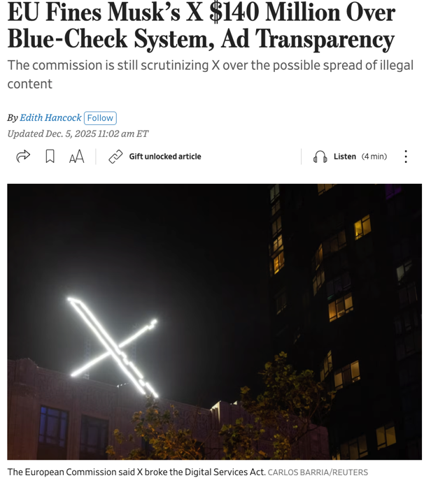 欧盟在公告和后续发言中强调,这次对X的罚款“与内容审查无关”,而是针对三个具体的透明度义务:“蓝标认证”设计是否误导用户、广告库是否完整公开、研究者数据接口是否充分开放。