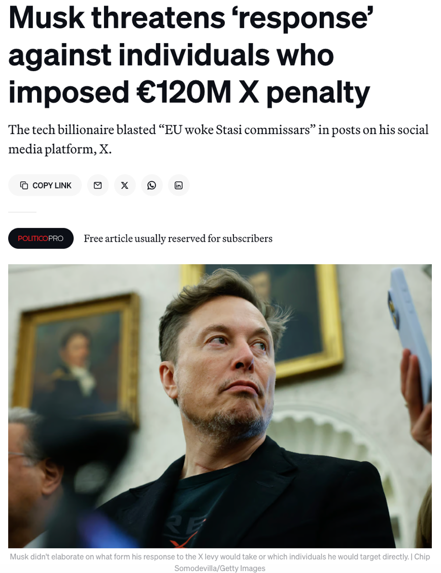 在这种背景下,一张技术性极强的DSA罚单被迅速政治化,几乎是“水到渠成”。美国可以把它当作欧盟“欺负美国科技”的新例证;马斯克则用极端表达为这一叙事提供“流量引擎”;欧盟则反过来以此提醒欧洲内部:美国不再是那个无条件的“盟友”,欧盟必须在数字和安全领域加快“自立”。