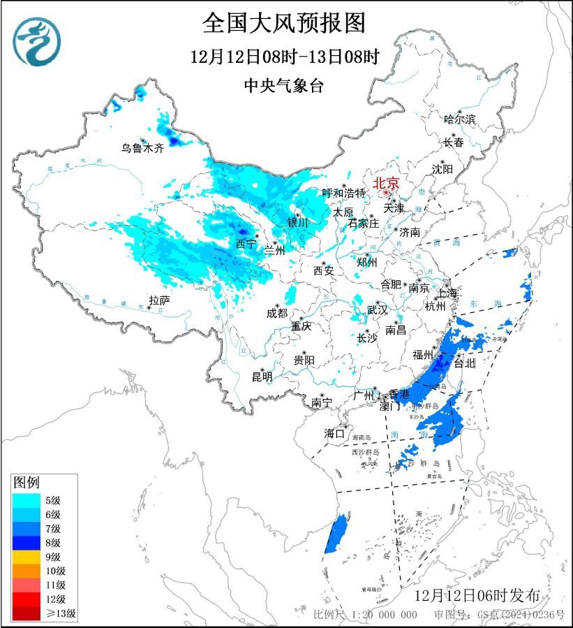 预计,12月12日08时至13日08时,新疆北部、青海、西藏北部、内蒙古西部、四川北部、甘肃东部、宁夏、陕西西北部等地部分地区有5~7级、阵风8~9级的大风,其中,新疆山口地区阵风可达10~11级;东海南部部分海域、台湾海峡、巴士海峡、南海东北部和中东部部分海域将有7级、阵风8~9级的大风。