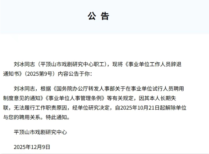 河南平顶山市戏剧研究中心12月9日在《平顶山日报》发布辞退公告。被辞退对象为平顶山市戏剧研究中心职工刘冰同志。公告称:刘冰同志,根据《国务院办公厅转发人事部关于在事业单位试行人员聘用制度意见的通知》《事业单位人事管理条例》等有关规定,因其本人长期失联,无法履行工作职责原因,经单位研究决定,自2025年10月21日起解除单位与您的聘用关系。