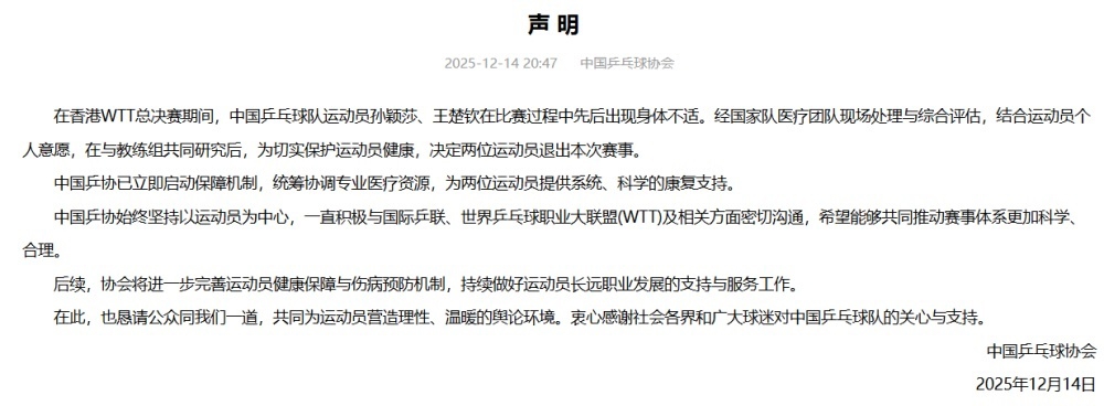 新华社北京12月14日电 中国乒乓球协会14日在其官网发布声明,对国乒队员孙颖莎、王楚钦在世界乒乓球职业大联盟(WTT)香港总决赛期间因身体不适退赛作出回应。协会表示,将进一步完善运动员健康保障与伤病预防机制,持续做好运动员长远职业发展的支持与服务工作。