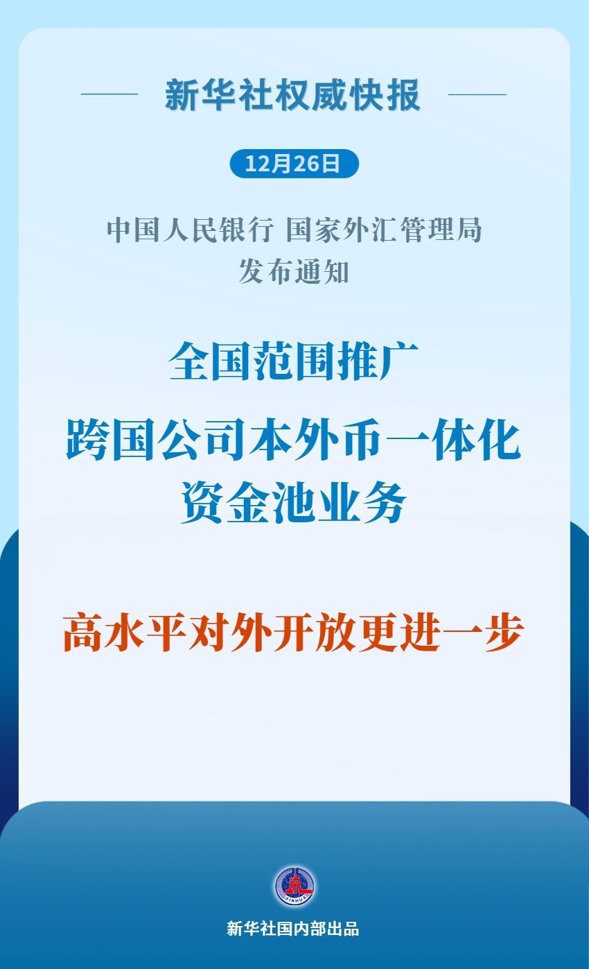 中国人民银行、国家外汇管理局12月26日发布通知,在总结前期部分地区试点经验的基础上,决定在全国范围内推广跨国公司本外币一体化资金池业务,进一步便利跨国公司集团资金归集、提高资金使用效率。该通知自发布之日起实施。