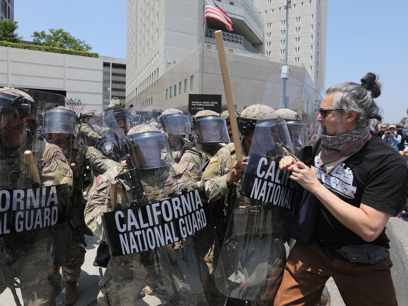 2025年6月8日,在美国加利福尼亚州洛杉矶市中心的联邦执法机构门前,抗议者与国民警卫队人员发生冲突。新华社发(邱晨 摄)