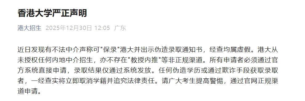2025年12月30日,香港大学通过“港大招生”发布严正声明,强调从未授权任何内地中介招生,也不存在“教授内推”等非正规渠道。所有申请者必须通过官方系统直接申请,录取结果仅通过系统发放。声明警告,任何伪造学历或通过欺诈手段获取录取者将立即取消学籍并追究法律责任。