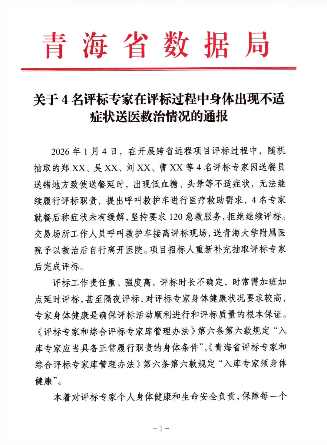 近日,青海省数据局在青海省公共资源交易网发布《关于4名评标专家在评标过程中身体出现不适症状送医救治情况的通报》。