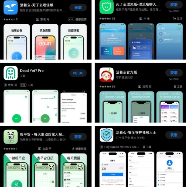 目前在苹果和安卓应用商店,均无法搜索到“死了么”,但存在大量同类应用,例如“活着么”“死了么漂流版”“Dead Yet?”“报平安”等等,均面向独居人群,功能形式也与“死了么”极为相似。