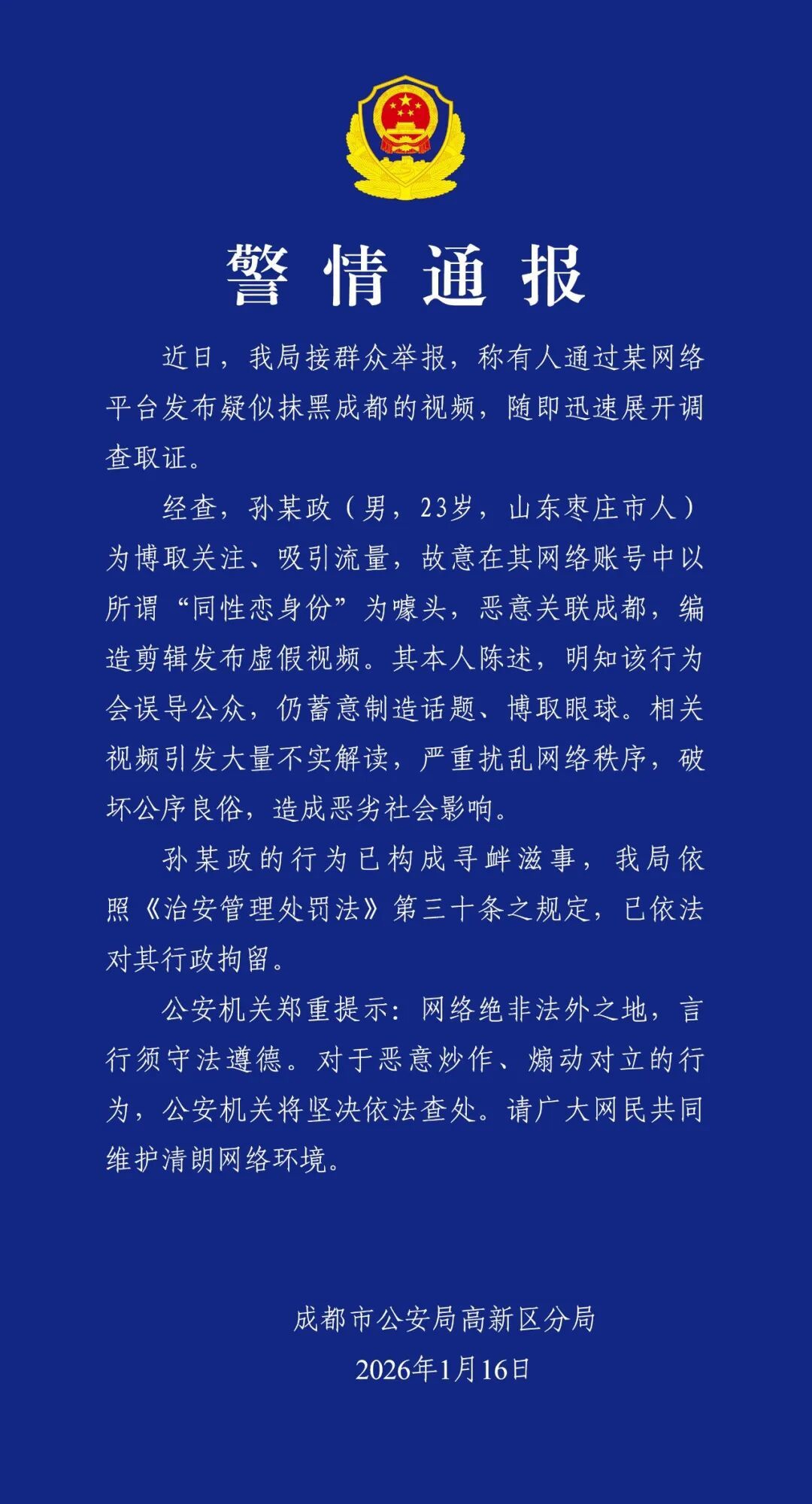 2026年1月16日,成都市公安局高新区分局发布警情通报: