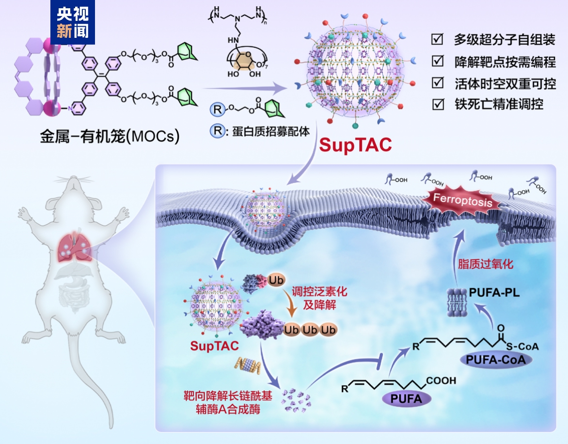 超分子靶向嵌合体具有可编程特性,通过更换不同靶蛋白招募配体,可实现多种蛋白质的协同降解,具备灵活适配清除不同致病蛋白需求的能力。同时,超分子靶向嵌合体还具有空间组织选择性,通过调控其表面物理化学性质及在体内的受体识别作用,建立了肺、肝等特定组织中靶蛋白的降解方法,显著抑制了脂多糖诱导的肺细胞铁死亡及炎症反应。