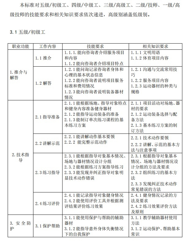 《社会体育指导员国家职业技能标准(修订版)》中社会体育指导员(五级/初级工)工作要求