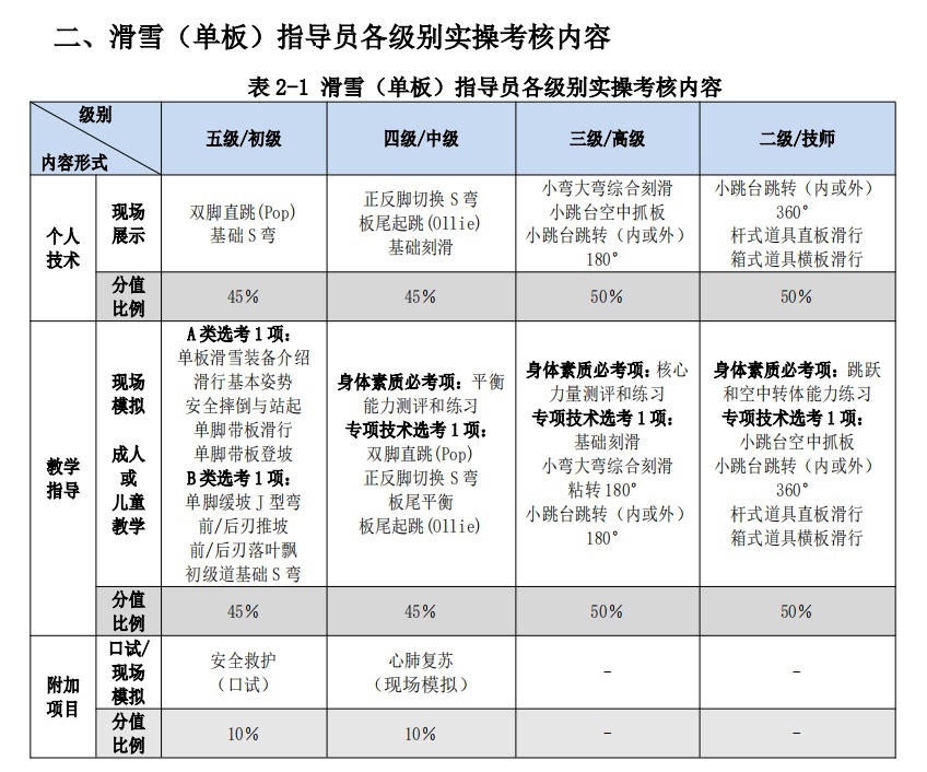 《滑雪(单板)指导员国家职业技能鉴定考核实施细则(2023版)》中各级别实操考核内容