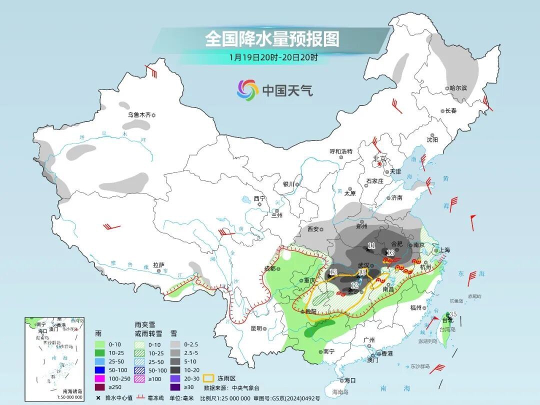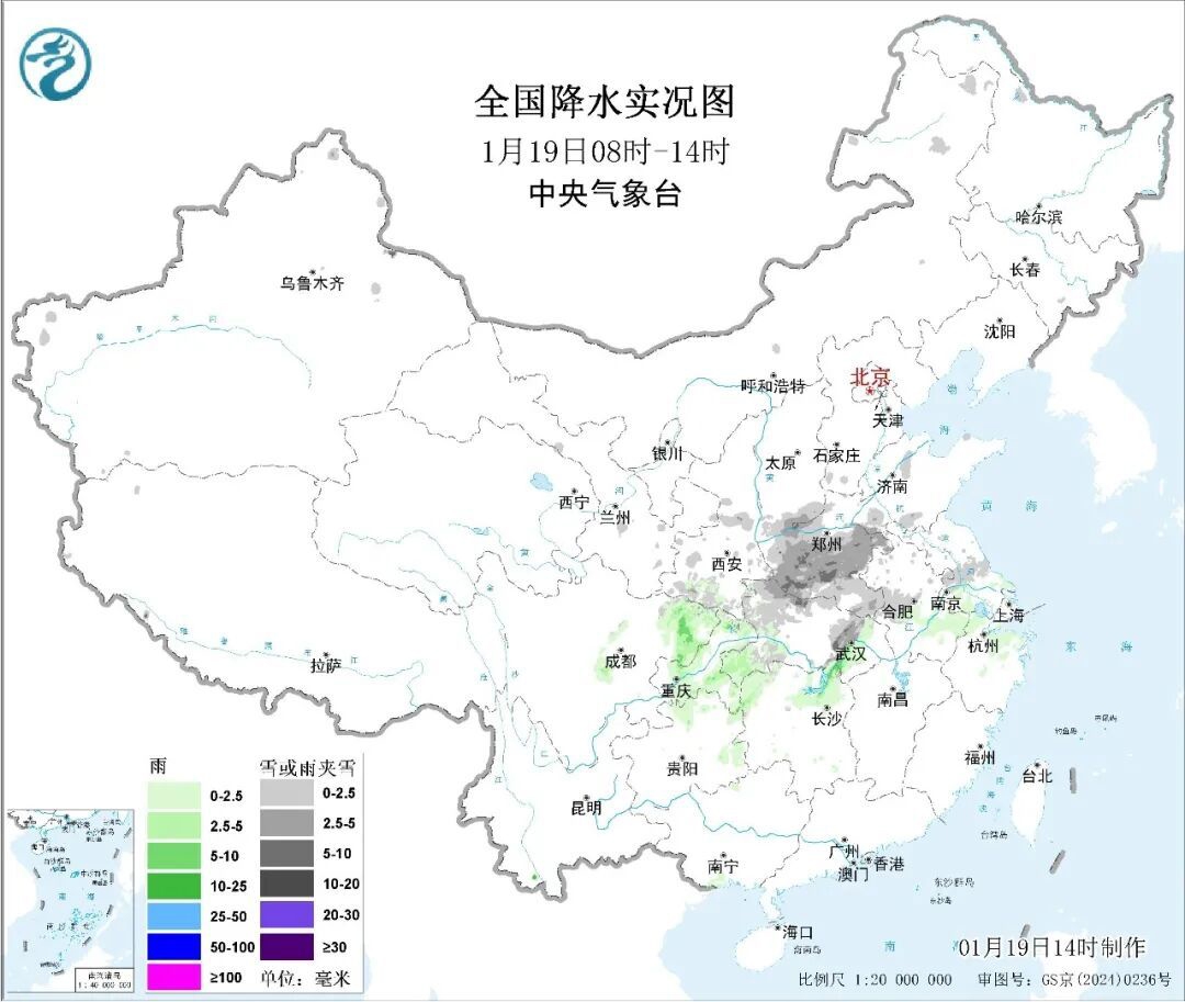 寒潮与暖湿气流相遇,还制造了今冬以来最强雨雪冰冻过程。19日开始进入本次过程的最强时段,19日8时至14时,甘肃东南部、陕西中南部、山西南部、河南、湖北北部、安徽北部、江苏北部等地出现降雪,河南信阳观测到冻雨。