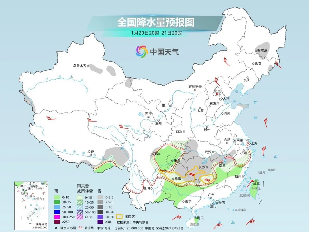 预计19日夜间到21日,贵州东部、湖南西部和中北部、重庆东南部、湖北南部、安徽南部、江西北部等地的部分地区有冻雨或冰粒。