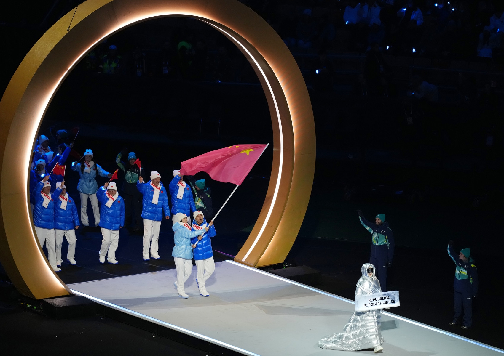 2月6日,中国体育代表团旗手宁忠岩(右)、张楚桐在开幕式上入场。新华社记者 李京 摄