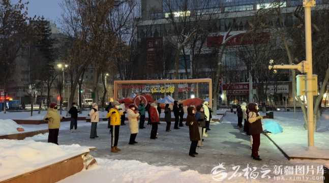 3月1日,乌鲁木齐飘着小雪。张阿姨和姐妹们依旧如约来到人民广场,音响打开,音乐响起,十来个人站成两排,在薄薄的雪上跳起广场舞。雪落在一位阿姨的绒线帽上,很快就被热气融化了。