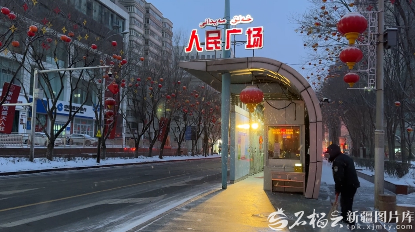 广场南侧,一个穿深色大衣的男青年快步穿过,手里握着刚买的馕,热气在冷空气里变成白雾。他走到BRT车站入口,脚步轻快,脸上带着笑。