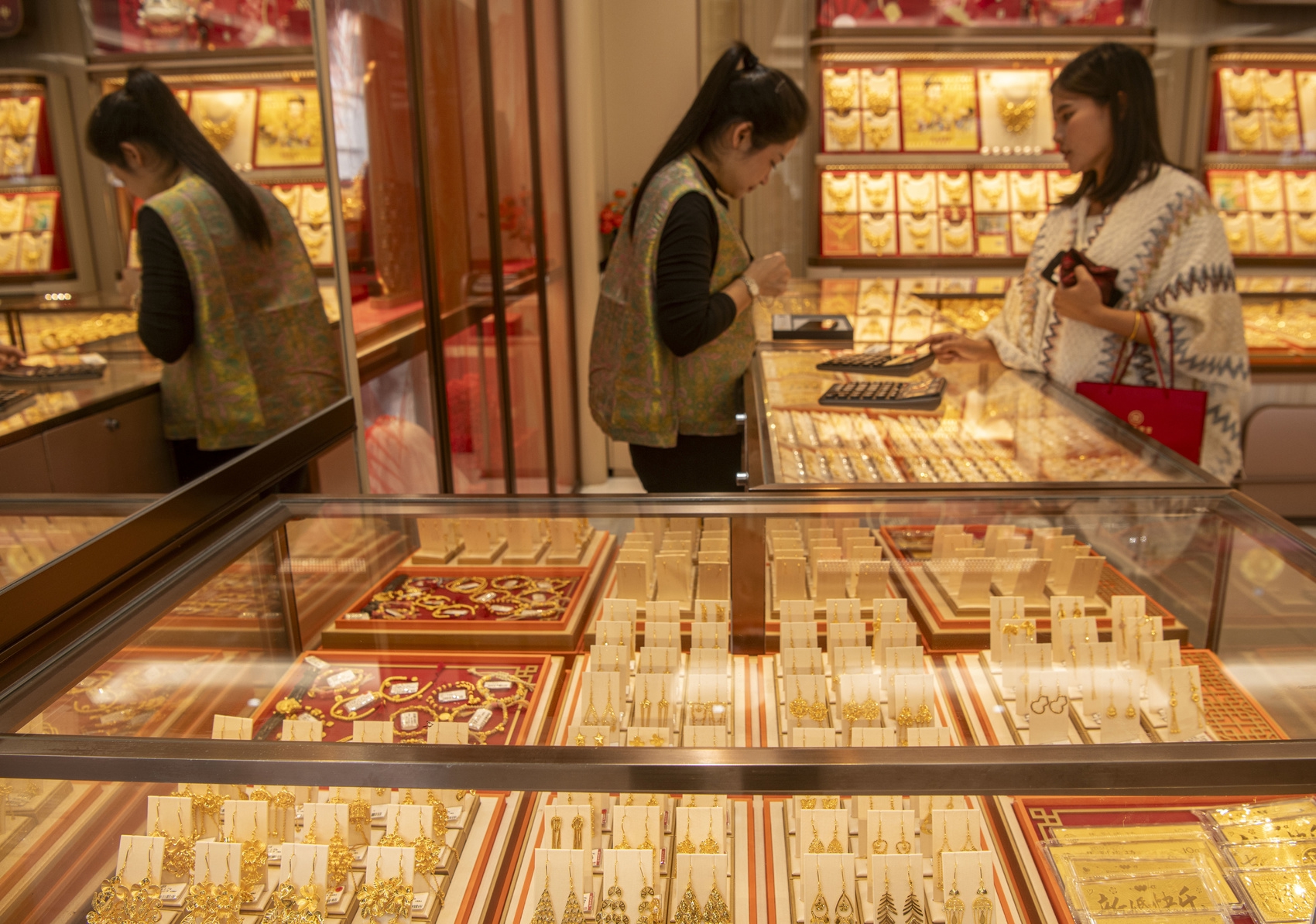 1月29日,顾客在海南省琼海市的一家金店选购金饰。新华社发(蒙钟德摄)