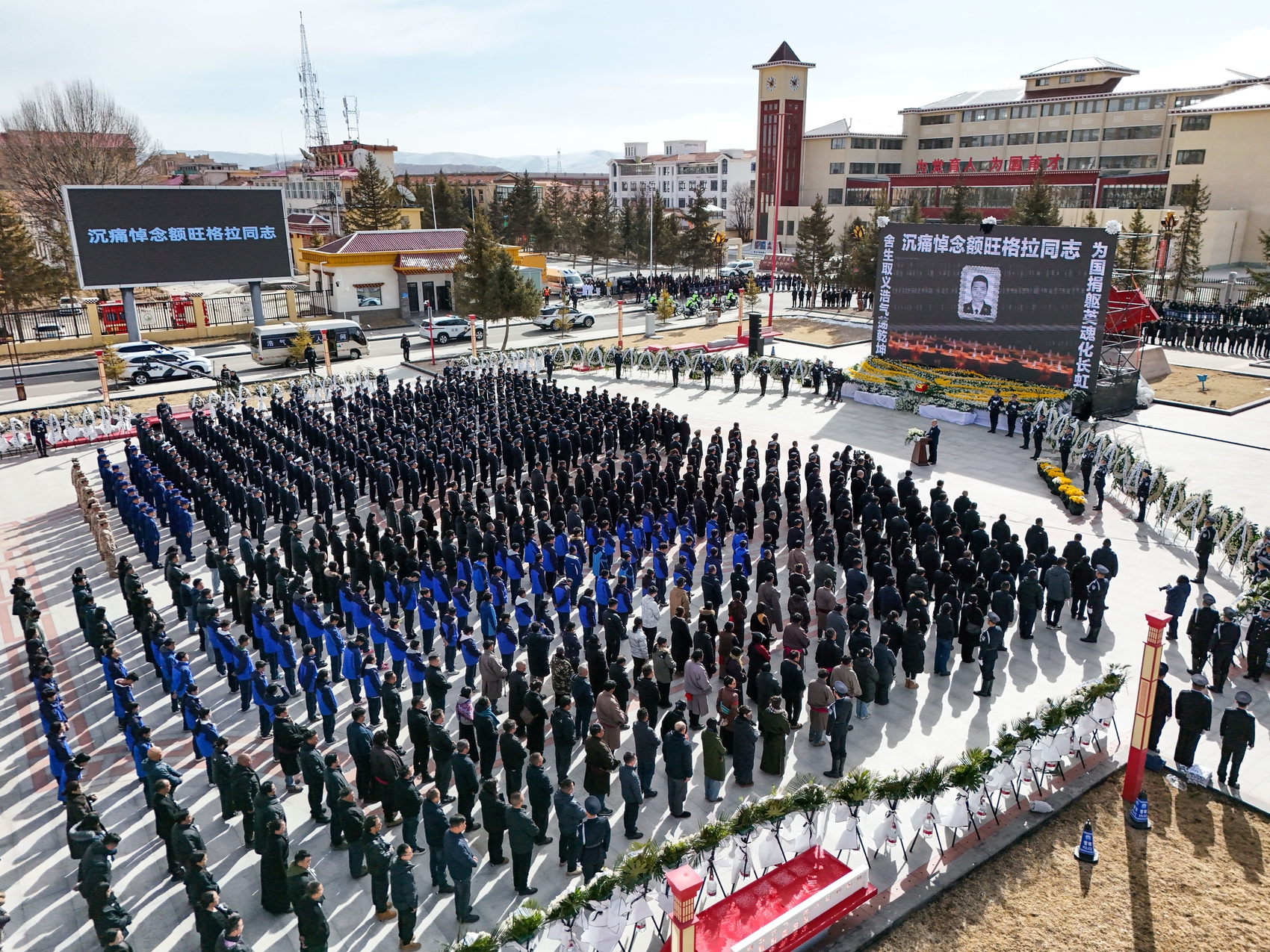 海拔约3500米的红原,几度飞雪。送别他时,战友、学生、干部、群众……人们挤满了红原县城的广场,一行行热泪打湿了脸颊。来自金川的藏族阿妈王正芳与阿旺素不相识,但一大早就守在街头。“他是为保护我们平安牺牲的。我一定要来送他!”