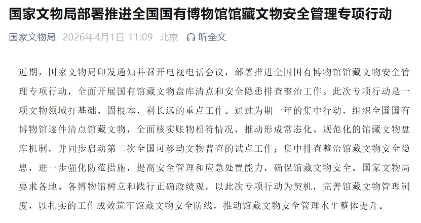 国家文物局统筹推进、不断深化馆藏文物安全管理工作。2025年12月召开的全国博物馆工作会议强调,要把藏品管理始终放在博物馆工作的首要位置,系统开展收藏、保护、研究、阐释,相关工作部署与重点任务将纳入文物事业“十五五”发展规划。此后,国家文物局深入核查处置相关舆情涉及的博物馆藏品管理问题,印发《关于加强博物馆安全工作的通知》《关于进一步规范国有博物馆接受捐赠藏品管理工作的通知》,督促指导各级文物行政部门和博物馆加强藏品管理基础工作,规范藏品定级、登账、建档和出入库等操作流程;严格履行捐赠藏品接收入藏程序,切实承担捐赠藏品保护利用责任。