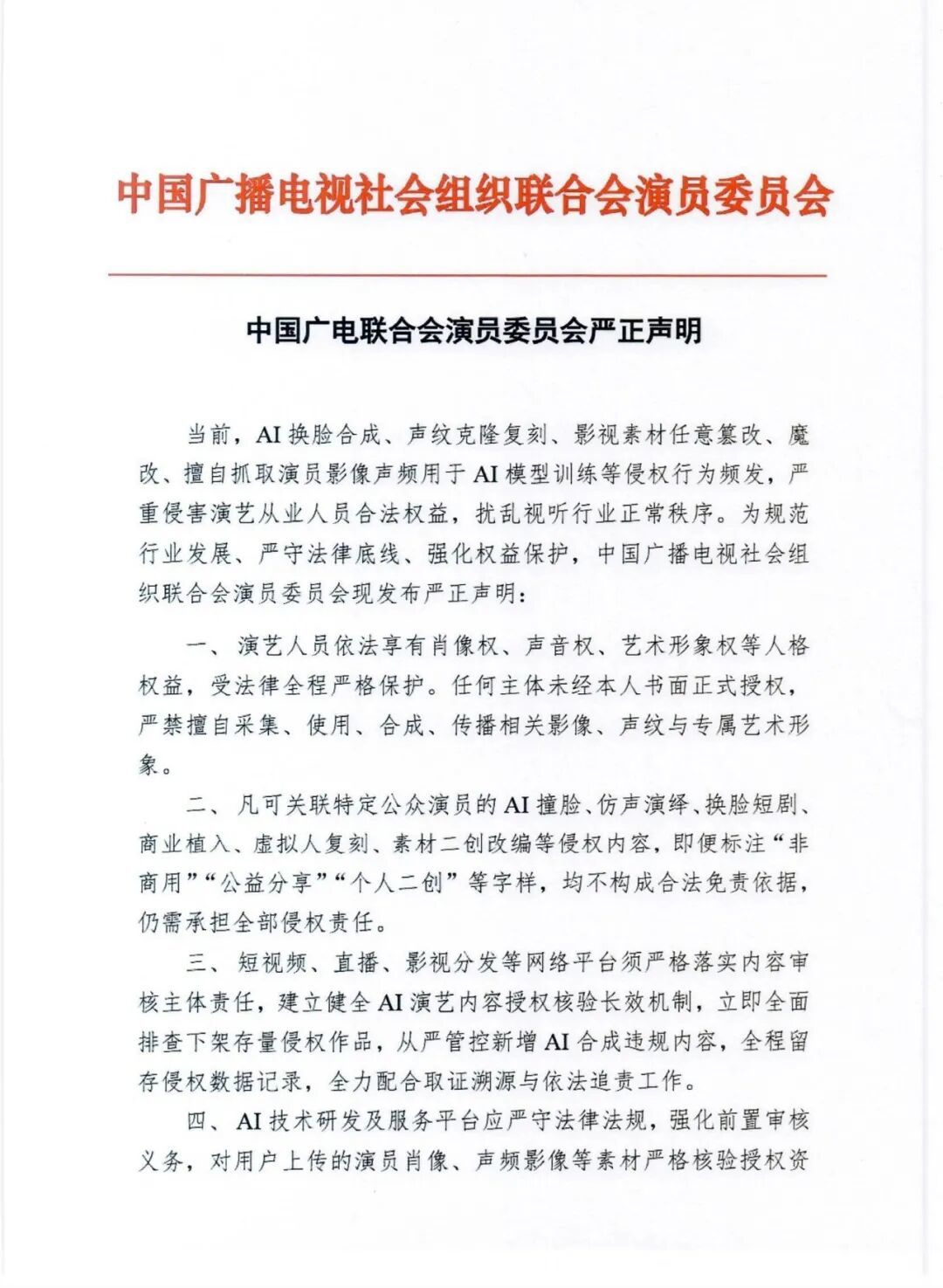 当前,AI换脸合成、声纹克隆复刻、影视素材任意篡改、魔改、擅自抓取演员影像声频用于AI模型训练等侵权行为频发,严重侵害演艺从业人员合法权益,扰乱视听行业正常秩序。为规范行业发展、严守法律底线、强化权益保护,中国广播电视社会组织联合会演员委员会现发布严正声明。