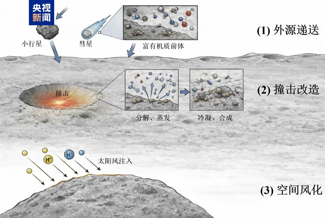 早期太阳系中,小行星和彗星像“快递员”一样,持续向类地行星输送有机质,以及碳、氮、氧、磷、硫等与生命化学密切相关的元素。这些外源物质可能为早期地球提供了部分可供生命起源和演化利用的化学原料。然而,地球长期经历活跃的地质演化和生命活动,相关早期记录已难以保存。相比之下,地质活动相对较弱的月球如同一枚“时间胶囊”,更可能保存地外有机质的输入及其后续演化信息。