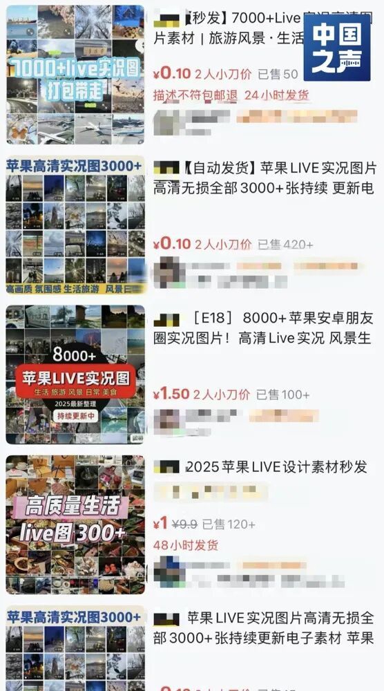 搜索购物软件和二手交易平台可以发现,多家店铺都在售卖名为“朋友圈实况图片”的商品,价格集中在1—8元。商家在商品详情页标注“可用于朋友圈配图、社交媒体起号”等,所售的照片统一通过网盘交付。