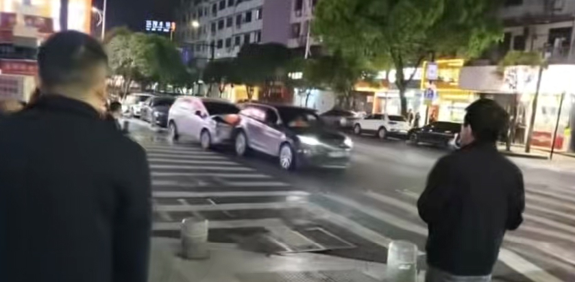 视频画面显示,一辆黑色路虎车顶着前方多辆停放车辆加速前进,随后又倒车冲撞后方车辆,将一辆汽车直接顶上了人行道。事故现场至少有两人瘫倒在地,多辆汽车不同程度受损。