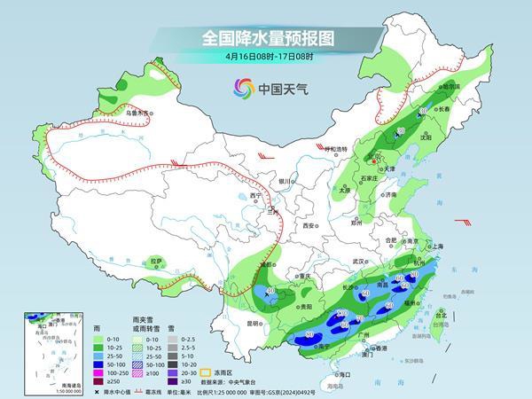 明天,新疆西部和北部、内蒙古东北部、黑龙江北部等地部分地区有小到中雨(雪),其中,新疆北部局地有大到暴雪。黑龙江大部、吉林北部、西藏东南部、四川南部、云南东部、重庆东部、贵州北部、江南南部、华南大部、海南岛、台湾岛等地部分地区有小到中雨,其中,广西东部、广东西部、福建东部等地部分地区有大雨。