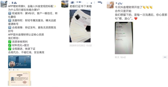 记者搜索发现,一些取得了金融机构理财师黄V认证的博主,他们发布的视频内容却并不是财经知识,而是专门“教授”如何申请认证。记者另注意到,一名认证为“某财经管理咨询有限公司理财师”、粉丝数量超60万的财经大V,其任职公司成立于2025年2月19日,该公司已于2025年12月26日撤销,且撤销前属于商务服务业,并非持牌金融机构。