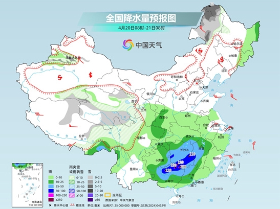 具体来看,中央气象台预计,今天,内蒙古东北部、黑龙江西北部、新疆沿天山西段和南疆高海拔山区、西藏北部和东部、青海、甘肃西南部、川西高原等地部分地区有小到中雪或雨夹雪,其中,内蒙古东北部、黑龙江西北部等地部分地区有中到大雪,黑龙江西北部局地暴雪;西南地区东南部、江南中西部、华南中北部、四川盆地东北部、陕西西南部、西藏东南部、黑龙江东北部等地部分地区有中到大雨,其中,湖南中南部、江西西部、广西北部等地部分地区有暴雨或大暴雨。