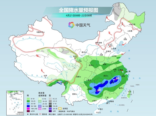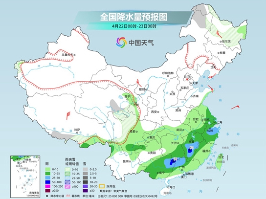 4月20日至22日,我国降水范围较大,南方多地雨势较强,西南地区东部、江汉南部、江南大部和华南中北部等地有大到暴雨,局地大暴雨,并伴有强对流天气,需注意防范。同时,受冷空气和阴雨影响,长江中下游及其以北多地气温下降,黄淮、江南等多地冷暖反差明显,公众请适时添衣,谨防感冒。