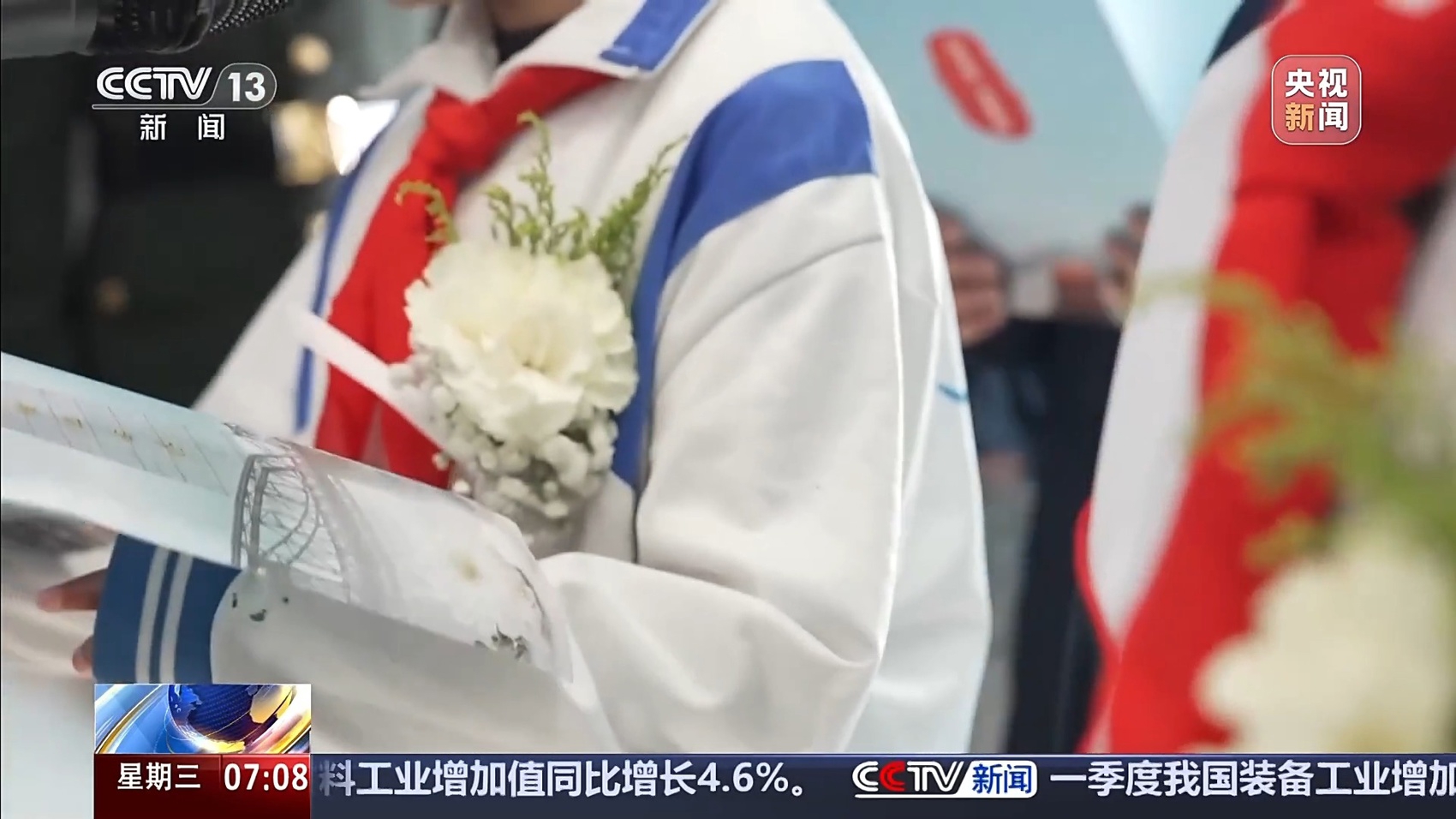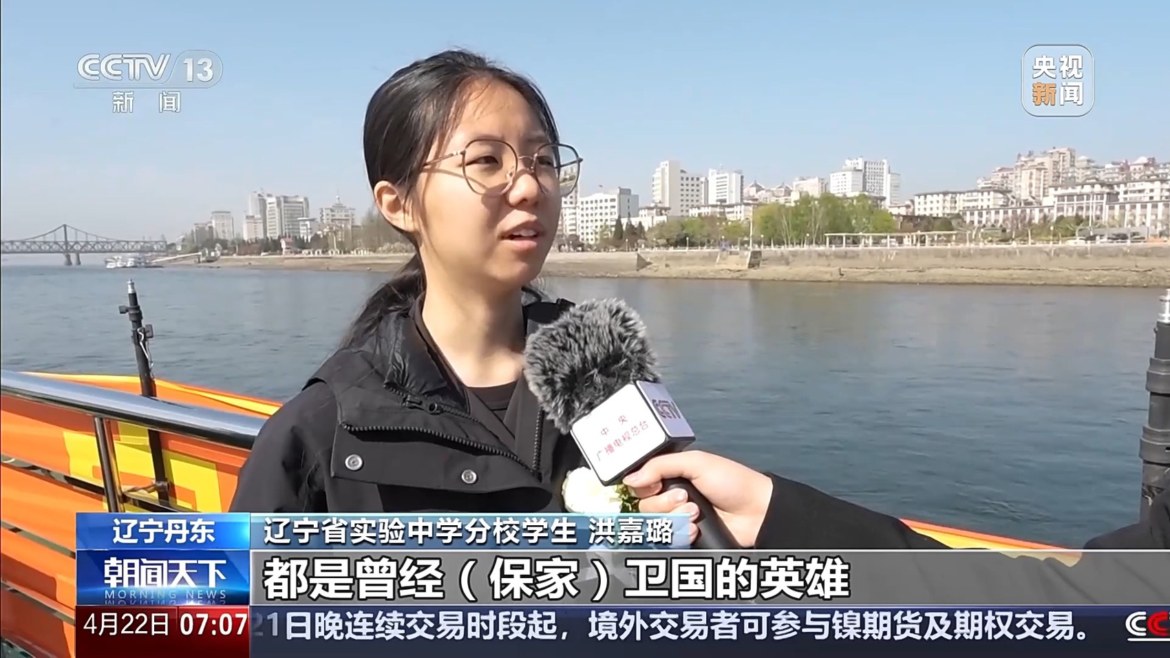 辽宁省实验中学分校学生 洪嘉璐:我内心觉得非常震撼,因为这些老战士们都是曾经保家卫国的英雄,他们如今可以站在鸭绿江边,回望他们的过去,缅怀他们的战友,内心肯定是非常动容。