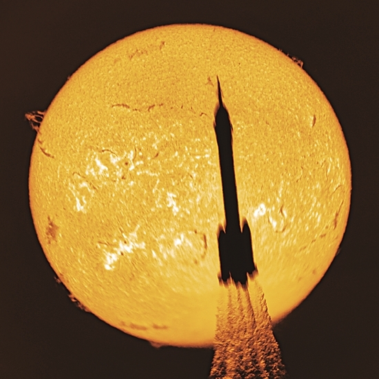 2025年11月25日,搭载神舟二十二号飞船的长征二号F遥二十二运载火箭成功发射。图为使用日珥镜拍摄的火箭凌日瞬间。新华社发