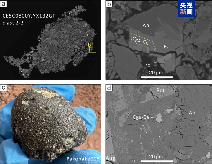 a: 嫦娥五号月壤;c: Pakepake005月球陨石;b,d: 铈嫦娥石及其共生矿物