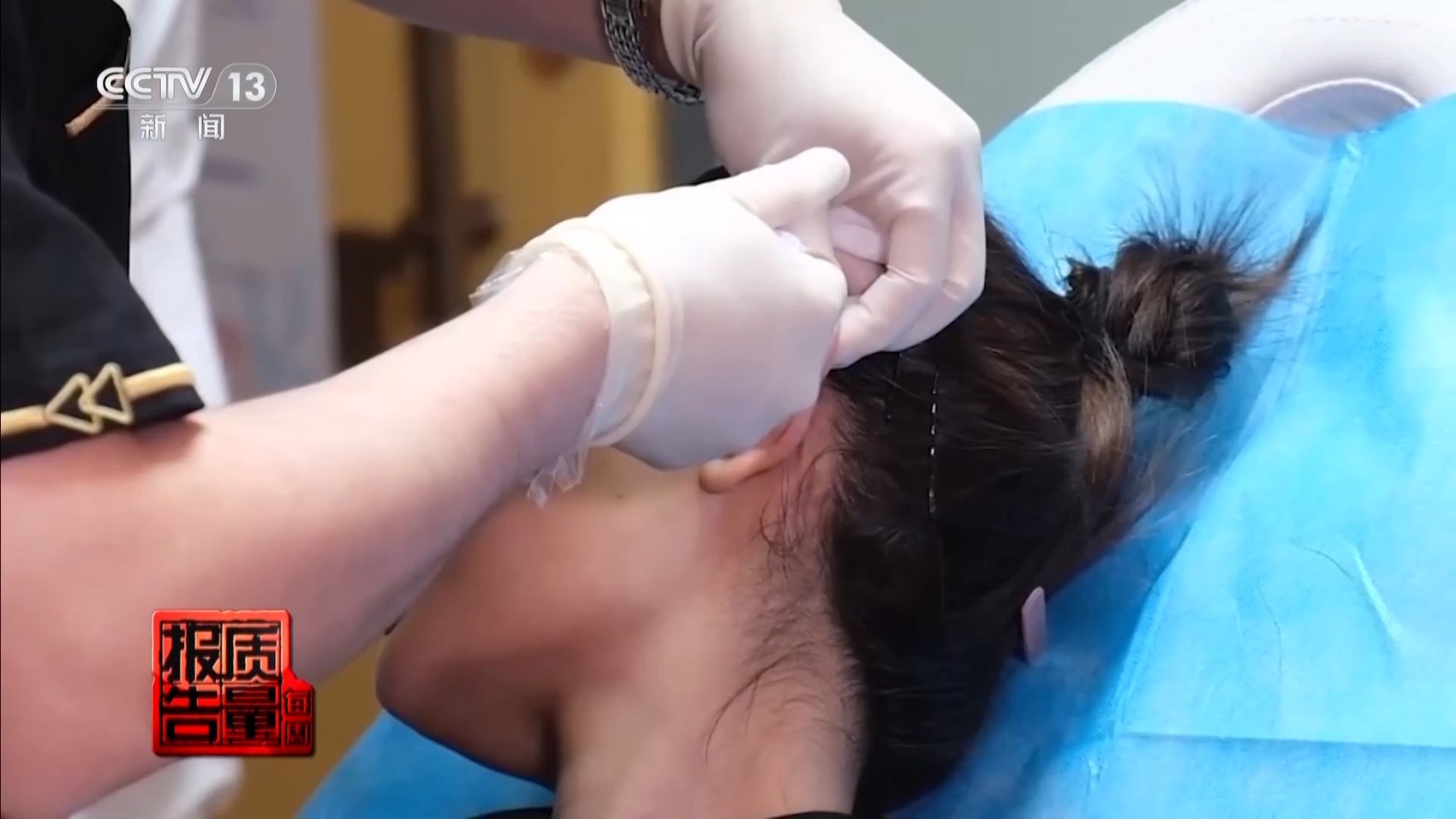 上海第九人民医院整复外科主治医师 许枫:她来的时候,首先看到严重的注射区域静脉淤血,也就是栓塞,通常的栓塞表现是整块皮肤呈暗红色,伴有剧痛。给她做体检的时候,就发现她整个面神经控制的区域表情都出了问题。