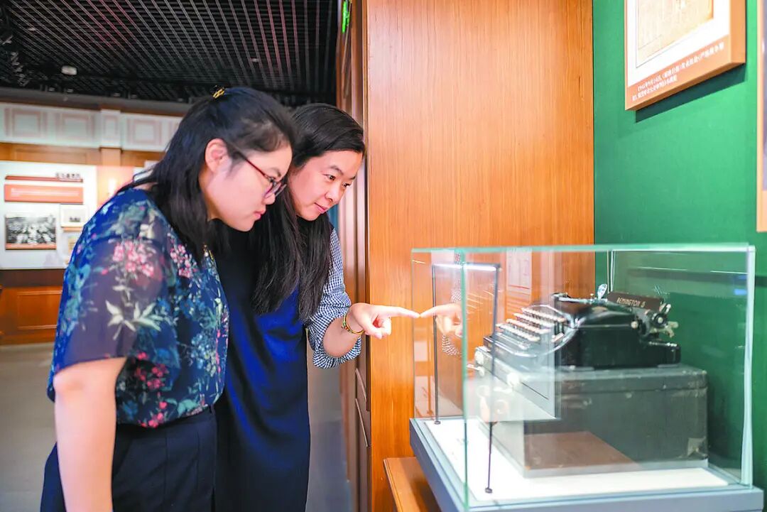 2025年9月19日,上海淞沪抗战纪念馆,观众正在参观中国检察官向哲濬参加东京审判时所使用过的老式打字机。王初摄(人民视觉)