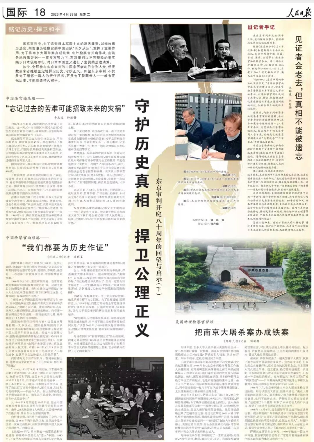 东京审判中,为了追究日本军国主义的滔天罪责,以梅汝璈为法官、向哲濬为检察官的中国团队“昕夕从公”,发挥了重要作用;为了将南京大屠杀案办成铁案,中外检察官并肩作战,走访各地搜集证据……在多方努力下,东京审判以不容辩驳的事实揭示日本侵略罪行,对日本军国主义进行了主要的法理清算。